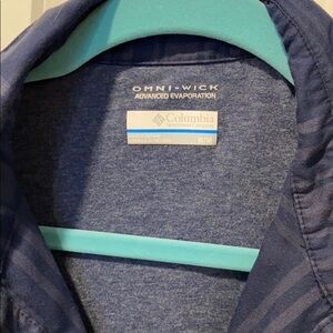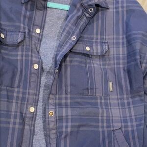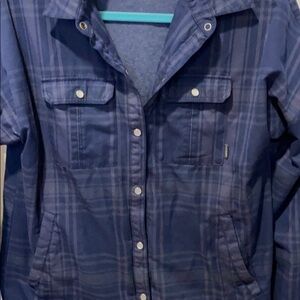 Thick shirt jacket shacket from Columbia Cool blue plaid, 2 sets of pockets Warm enough to wear as a jacket- I wore it snowboarding Snap close, size medium, runs slightly snug Measures approximately 19” pit to pit and 23” shoulder to hem Men’s inspired warm winter lined flannel plaid