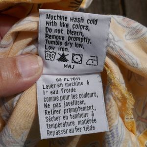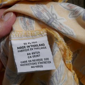 Columbia yellow short sleeve button up shirt with allover dragon fly print. Chest pocket, full button, collared shirt. Cotton/rayon blend.