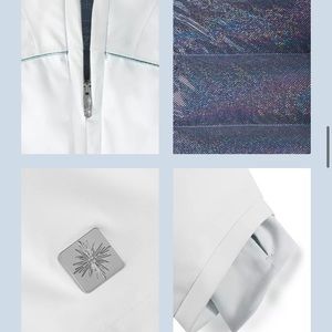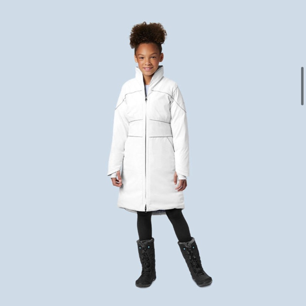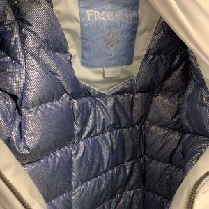 Girls limited edition Frozen Elsa Columbia jacket. Inspired by brave and powerful Elsa, this jacket is truly enchanting. A form-fitting, down silhouette makes it a stylish yet functional piece for the coldest conditions. Icy colors, iridescent trim, premium silver-chrome hardware, and holographic Omni-Heat™ reflective lining. Will come with dust jacket and special edition hanger.