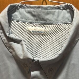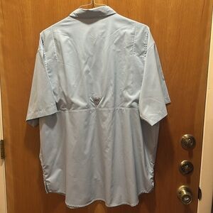 Preowned. Two pocket short sleeve. Vented back. Split round bottom. 24 1/2 inches pit pit and 33 inches long. Color is light blue.