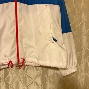 Perfect for layering on breezy days or light rain, this jacket features a striking blue and white colorblock design with eye-catching red zipper and drawstrings. It's lightweight, packable, and ideal for outdoor adventures, casual wear, or everyday errands.