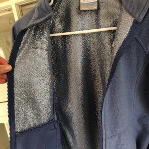 Pretty periwinkle colored fleece zip up coat. Gently worn. Non- smoking home. Great condition except for a small cut on the cuff of one sleeve, see the pics. This doesn't affect the coat and hasn't been a problem in laundry. Child size MEDIUM, my child wore this as a 9/10 yo.