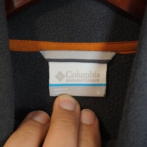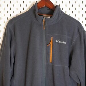 Keywords: Columbia, fleece jacket, mens, gray, orange, full zip, outdoor, lightweight, layering, hiking, casual, sporty, jacket, L, Large