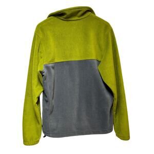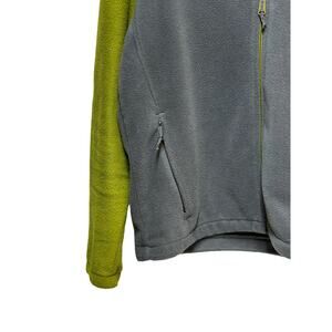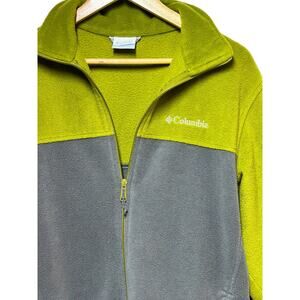Stay warm in this Columbia fleece jacket in green and gray, men's size medium. Features a full zip front, stand collar, and soft fleece construction—ideal for hiking, layering, or everyday wear.