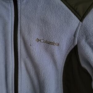 Features: color block, paneled, periwinkle, purple, lavender, black, long sleeve, collar, full zip, thumb holes, pockets