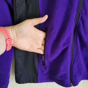 Features: purple, dark, black panels, full zip, pockets, polyester, elastane, soft