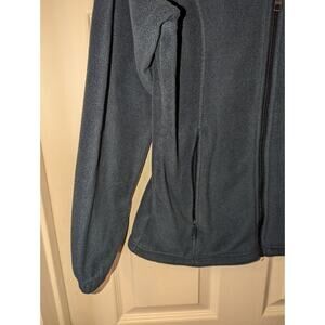 The blue jacket has a classic fit and is accented with a zipper, embroidered logo, and is lined with polyester. It is suitable for travel, casual wear, and workwear. The jacket is available in size M and has a chest size of 36-37.5 inches. The fleece material provides soft fabric and cold weather comfort. This jacket is perfect for the spring season and is great for any woman who loves outdoor activities.