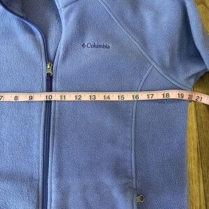 full zip fleece jacket, Columbia, women’s jacket, size large, periwinkle fleece, fleece lined pockets, zipper pockets, embroidered logo, pit to pit 20 inch, length 24 inch, size tag removed, womens outerwear, relaxed fit, boho luxe, outdoor fashion, versatile layering