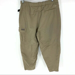 A little bit of stretch. Lots of zippered pockets! Nylon webbing belt. Good used condition- no stains holes or heavy wear.