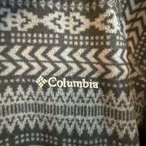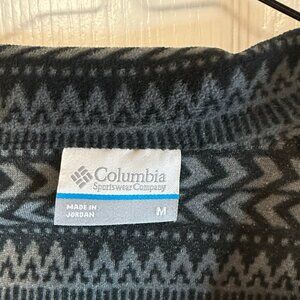 This is a lightweight, soft, Columbia half-zip fleece with a black with a gray geometric pattern. The gray is a little darker than the pictures show. Size medium, fitted styling. Perfect sweater substitute or mid-layer. Previously loved, but in excellent, well cared-for condition.
