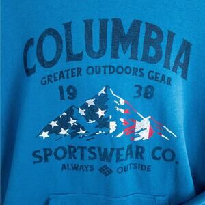 Columbia men’s hoodie, Medium. Blue pullover with bold Americana mountain graphic and “Always Outside” slogan. Clean midweight fleece in a heritage.