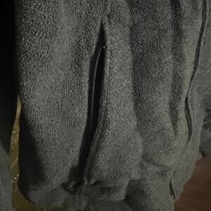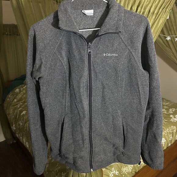 Cozy charcoal gray Columbia fleece jacket in size Small. Classic full-zip style with embroidered logo on the chest, zippered hand pockets, and a soft, plush fleece exterior. Perfect lightweight layer for cool weather. Gently used, excellent condition with no stains, holes, or pilling.