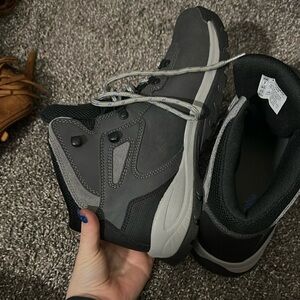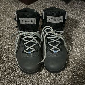 These Columbia boots are designed for outdoor enthusiasts, featuring a durable gray and black construction with a rugged outsole for superior traction. The boots offer a blend of performance and style, with reinforced toe caps and padded collars for added comfort and protection. Ideal for hiking adventures, they combine a sporty design with practical features to ensure a reliable and comfortable experience. never been worn