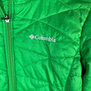 Green puffer jacket, full front zip, 2 front zip pockets, 100% Polyester