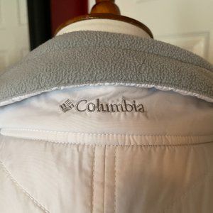 Grey and white together make this Columbia vest unique. White fabric is nylon and the grey on the lapel and sides is a soft fleece material. Cute stitching design with side pockets on each side. Machine washable.
