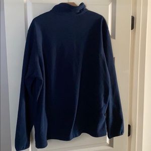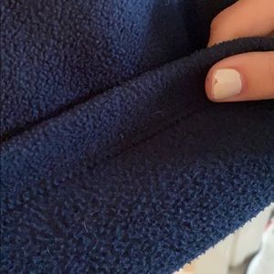 Navy, fleece (inside & out), royal blue zipper accents, half zip, zipped front pocket (can fit a phone), synched wrists, like new condition
