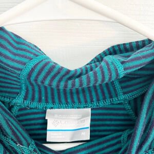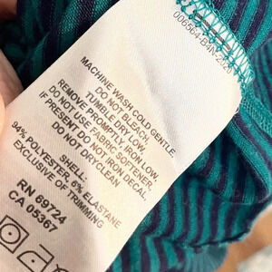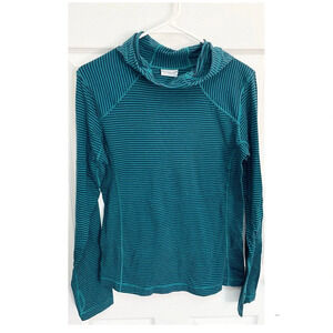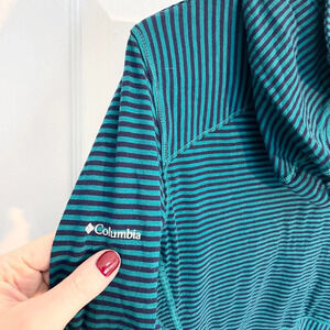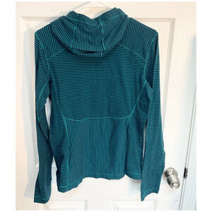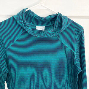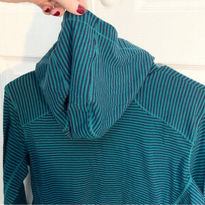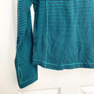 Teal greenish-blue and dark blue striped long sleeve running layer top. Darting for a flattering fit.
