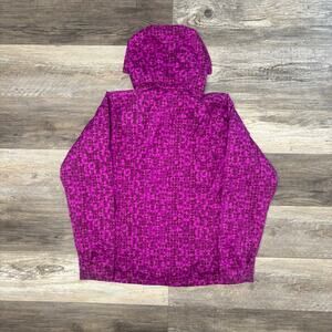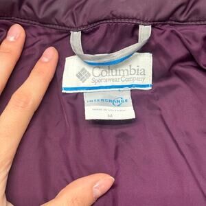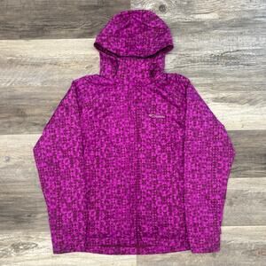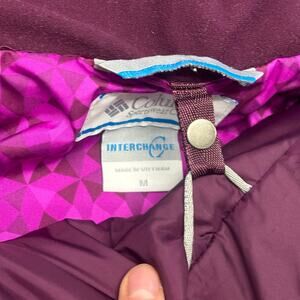 Columbia Interchange Plum Purple Womens M 2-in-1 Abstract AOP Patterned Jacket Pre-owned condition, please note that the item has stain on the sleeve hem, long sleeve full zip shell polyester nylon lining removable lining and hood high neck solid colorful abstract print pockets logo hiking outdoorsy gorpcore athleisure sporty.