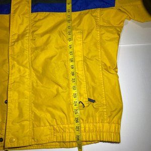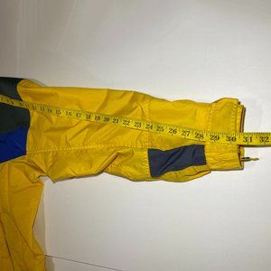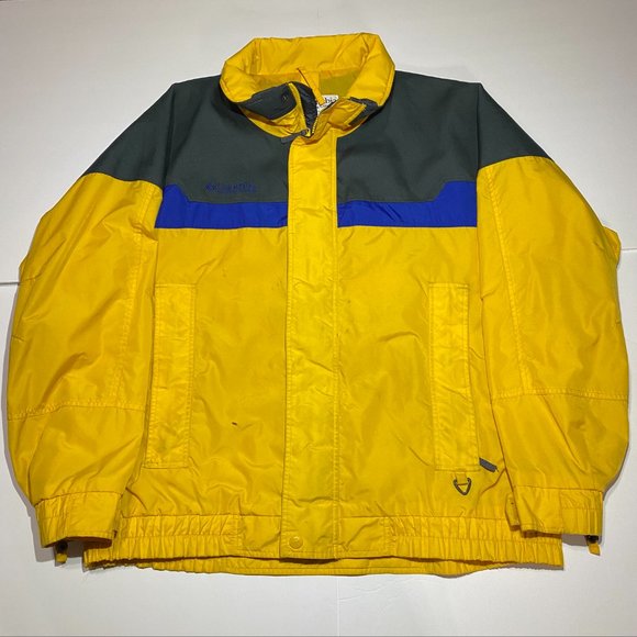 Columbia Jacket in good condition, has 2 small stains, all the zippers and buttons work, tricolor Yellow, blue, and grey, with hood attached to it. if you have any questions feel free to message me.