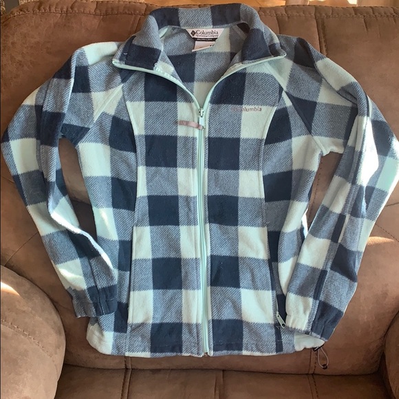 Plaid Columbia Jacket. Worn several times. No flaws. Zippers in front and on pockets. Cinched bottom and arm holes. Fuzzy and warm.