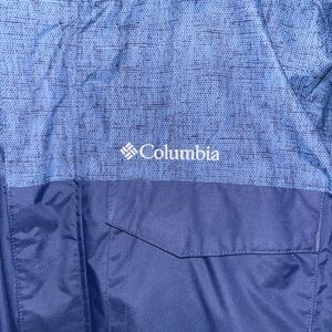 Columbia hooded jacket in a two-tone blue design. Full front zipper and chest logo. Textured heathered upper with solid navy lower. Lightweight shell for layering.