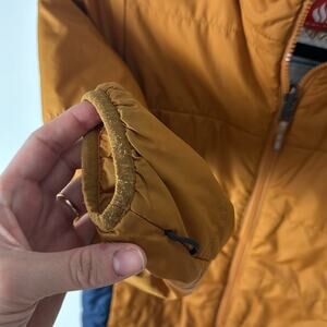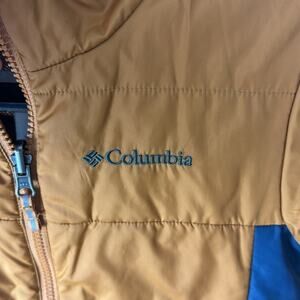 Gently Used Columbia Full Zip Omni-Heat Jacket. This is a boy's small. Mostly a light orange color with blue accent on the sides. Stitched on Columbia logo and text on the chest. Two front pockets. Medium weight but will be quite warm!