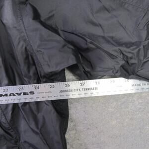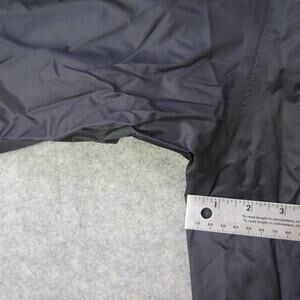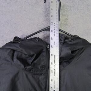 Black nylon shell with full zip front, drawstring hood, and elastic cuffs