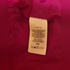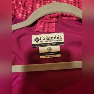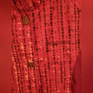 This Columbia Omni Shield jacket is designed for girls size 18/20. It features a pink nylon outer shell with a geometric pattern, hood, full zip closure, and zip pockets. The long sleeve ski coat is insulated with polyester, suitable for winter, fall, and spring. The jacket will make you feel like Barbie, making it a fun and practical choice for outdoor activities like skiing. Please review measurement pics to ensure fit.
