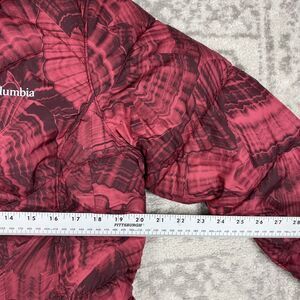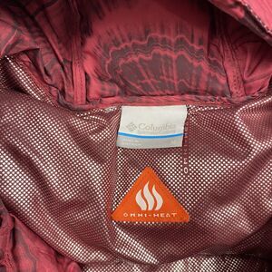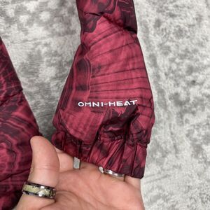 The product is a women's Columbia jacket in a size medium, featuring a purple down Omni Heat puffer design with a mock neck. Made of polyester with a softshell fabric type, this basic jacket is perfect for travel, casual outings, or workwear. It includes features such as a hood, full zip closure, insulation, and is machine washable. The jacket also has a quilted, zipper, and logo accents, and is suitable for fall and winter seasons. With a solid pattern and long sleeves, this Columbia jacket is ideal for outdoor activities like skiing or nature adventures.