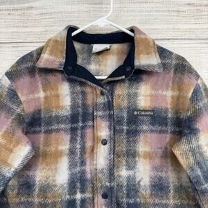 Columbia Jacket Women's Small Pink Brown Plaid Fleece Shacket Outdoors Pockets