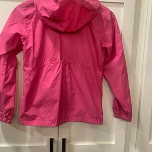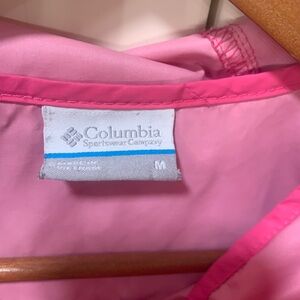Bright fuchsia raincoat by Columbia. Lightweight and water-resistant. Ideal for rainy days.