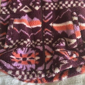 Cozy fleece jacket with vibrant patterns. Features a full zip front. Perfect for chilly days.