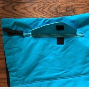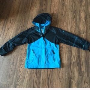 Very sharp with aqua and black and black embroidered design on back. Zips up front and Velcro closure. Has 2 snaps and Velcro closure at neck. Pockets in front also zip with Velcro closure. Adjustable at wrists with Velcro.