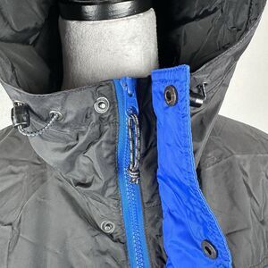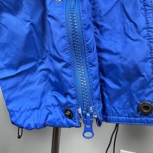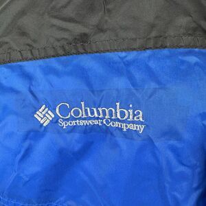 This Columbia men's jacket is a vintage-inspired windbreaker in blue, made of lightweight and water-resistant softshell nylon. It features a full zip closure, a hood, multiple pockets, and is packable for easy travel. With a stand-up collar and polyester lining, this mid-length jacket is suitable for outdoor activities like skiing, hiking, and jogging in various seasons.