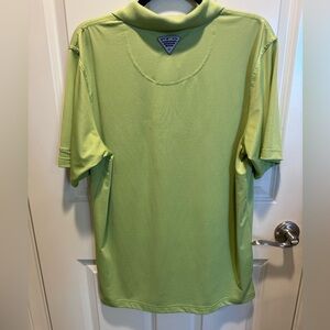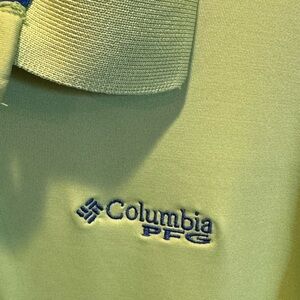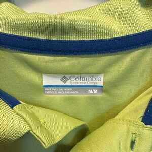Lime green Columbia polo featuring blue accents. Classic collar design. Some stains on the back of the polo see pictures