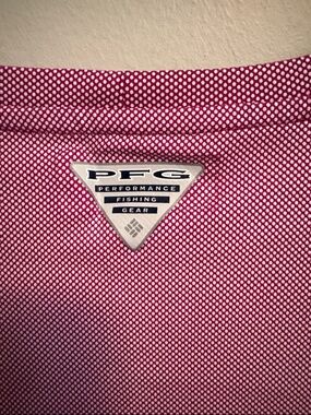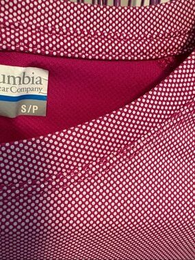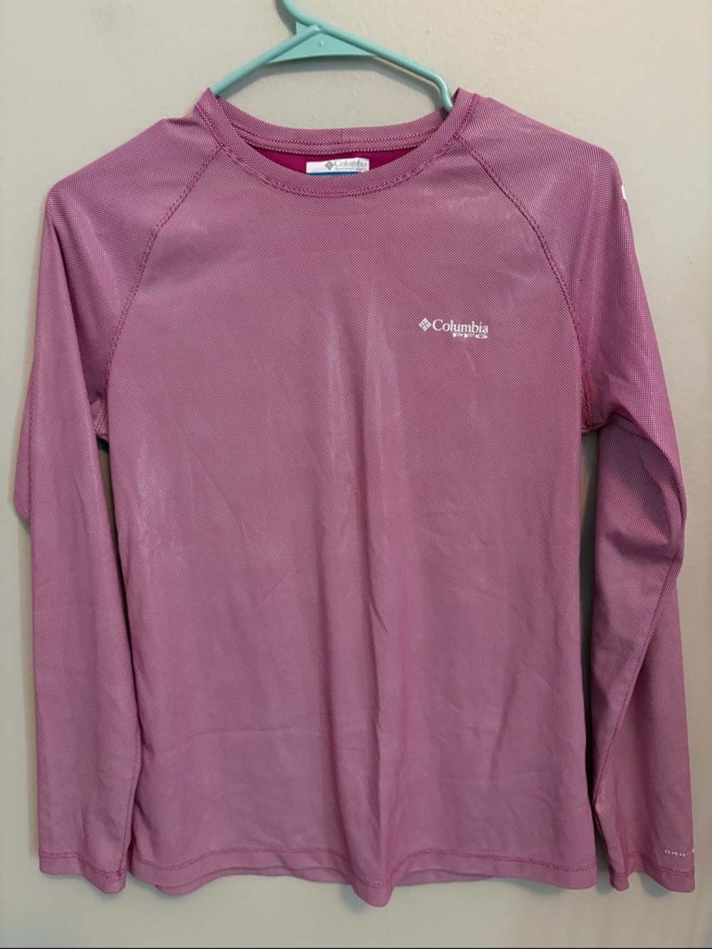 Breathable long sleeve performance shirt. Moisture-wicking fabric for active use. Small Columbia logo on chest. Raspberry color with white very small dots hovering it a shimmery look. Last picture up close gives the truest color. Ideal for hiking and everyday wear.