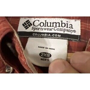 This Columbia men's button-up shirt features a classic plaid pattern in burnt orange, with a collared neckline and long sleeves. The shirt is made of woven cotton material, making it comfortable and easy to care for. It has a regular fit and is available in size 2XB.