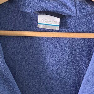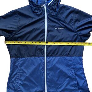 Columbia May Valley Fleece Lined Windbreaker, super soft micro fleece lined interior, color is Navy blue and royal blue with white hood lace and zipper, size Womens L