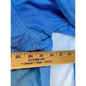 In gently used condition, this blue chambray shirt features pearl snap closures, long sleeves, and a comfortable fit.