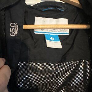 Warm and durable Columbia puffer jacket featuring 650-fill down insulation and Omni-Heat reflective lining for maximum warmth. This jacket includes a removable hood, chest pocket, zip hand pockets, and adjustable hem drawcord for customizable fit. Goggle pocket and powder skirt. Ideal for winter weather, commuting, or outdoor adventures.