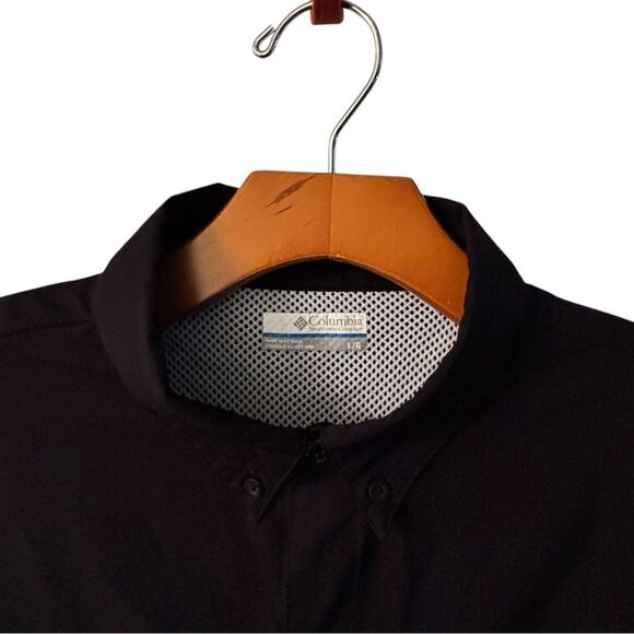 Classic black button-down shirt. Short sleeves. Two chest pockets. Columbia logo detail.