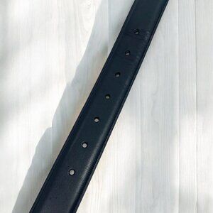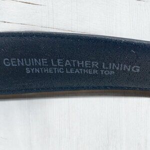 This Columbia men's belt combines durability with style. Featuring a genuine leather lining and a synthetic leather top, it offers a sleek, polished look suitable for business or casual settings. The classic black color with silver buckle complements any wardrobe, making it a versatile accessory. Size 34", with buckle and 7 holes for an adjustable fit. Excellent preowned condition. No visible flaws.