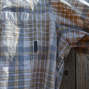 Columbia Sportswear men's short sleeve shirt. Tan, gray, white plaid. Chest pockets. 100% cotton.