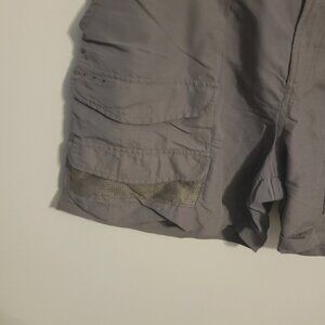 Men's gray hiking or fishing shorts by Columbia, waist size 36. Front slant pockets, an additional velcro pocket with mesh, along with two back velcro closure pockets. Shorts are pull on style with a zipper and button closure. Excellent pre-owned condition; no flaws. Please see close-up pictures for more details.