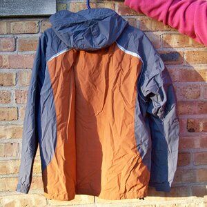 This is for a men's windbreaker jacket. Has a hood, pockets on the front and sides. Size is M. Color is grey and orange.