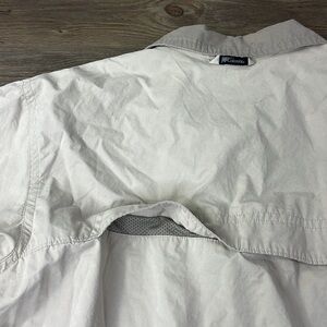 Columbia Men’s Khaki Tan Zip Up Vented Jacket, size Large. In good used condition, a couple of little spots on it shown in pictures. See pictures for measurements and fabric content.