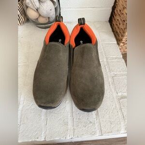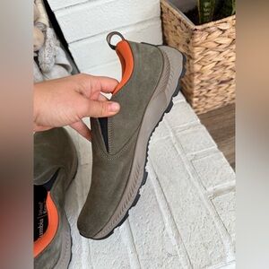 Stylish green loafers with vibrant orange lining. Easy slip-on design. Ideal for casual wear.