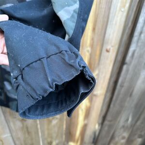 The Columbia Loma Vista Hooded Jacket is a men's windbreaker in size large, featuring a black camouflage pattern. Made from fleece, both the outer shell and lining provide warmth and comfort. It includes a full zip closure, hooded design, and the Columbia logo accent. Ideal for casual occasions and outdoor activities like hiking, this mid-length jacket is perfect for fall. The jacket is pre-owned. Lots of lint on the jacket couldn’t find my lint roller.