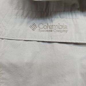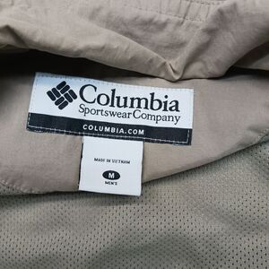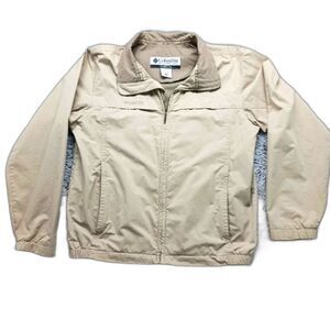 Columbia Men's Medium lightweight Jacket extra Pockets. Tan/ cream color. Front zip, 2 front side zip pockets, 2 interior snap close pockets, and Breathable chest and back flaps.