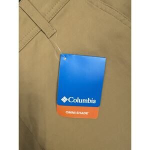 The Columbia Men’s Omni Shade Beige Shorts in size 42x10 offer UPF protection and Omni Wick technology, making them ideal for outdoor activities. These solid shorts have a zip closure, flat front design, and are made of a lightweight microfiber fabric blend of nylon and spandex. With features like easy care, quick-drying capabilities, and pockets, these Bermuda-style shorts are perfect for travel, casual wear, and workwear, while also providing sun protection for the modern man on the go.